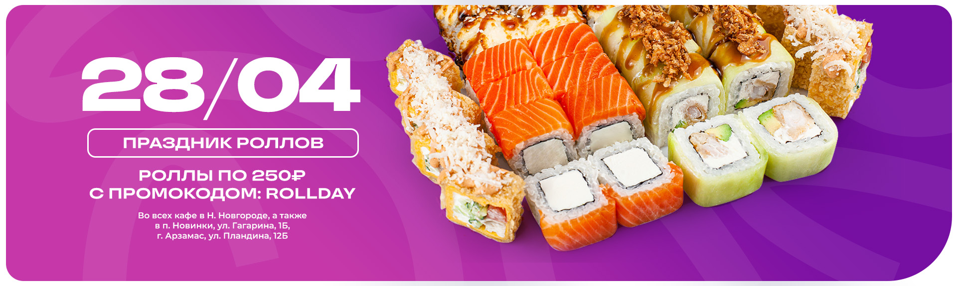 📅 28 апреля пройдет Праздник роллов! Наслаждайтесь блюдами с акционным значком «Праздник роллов» всего за 250 ₽, используя промокод ROLLDAY 📍 Адреса ресторанов: