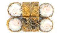 Чак темпура 2.0 сыр плавленый, сыр сливочный «Cremette», соус "Брусничный", темпура, рис, тесто "Хару Маки", сырные палочки Моцарелла