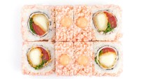 Годзилла курица вареная, краб-крем, огурец, соус чесночно-сырный, соус "унаги", кунжут, рис, нори